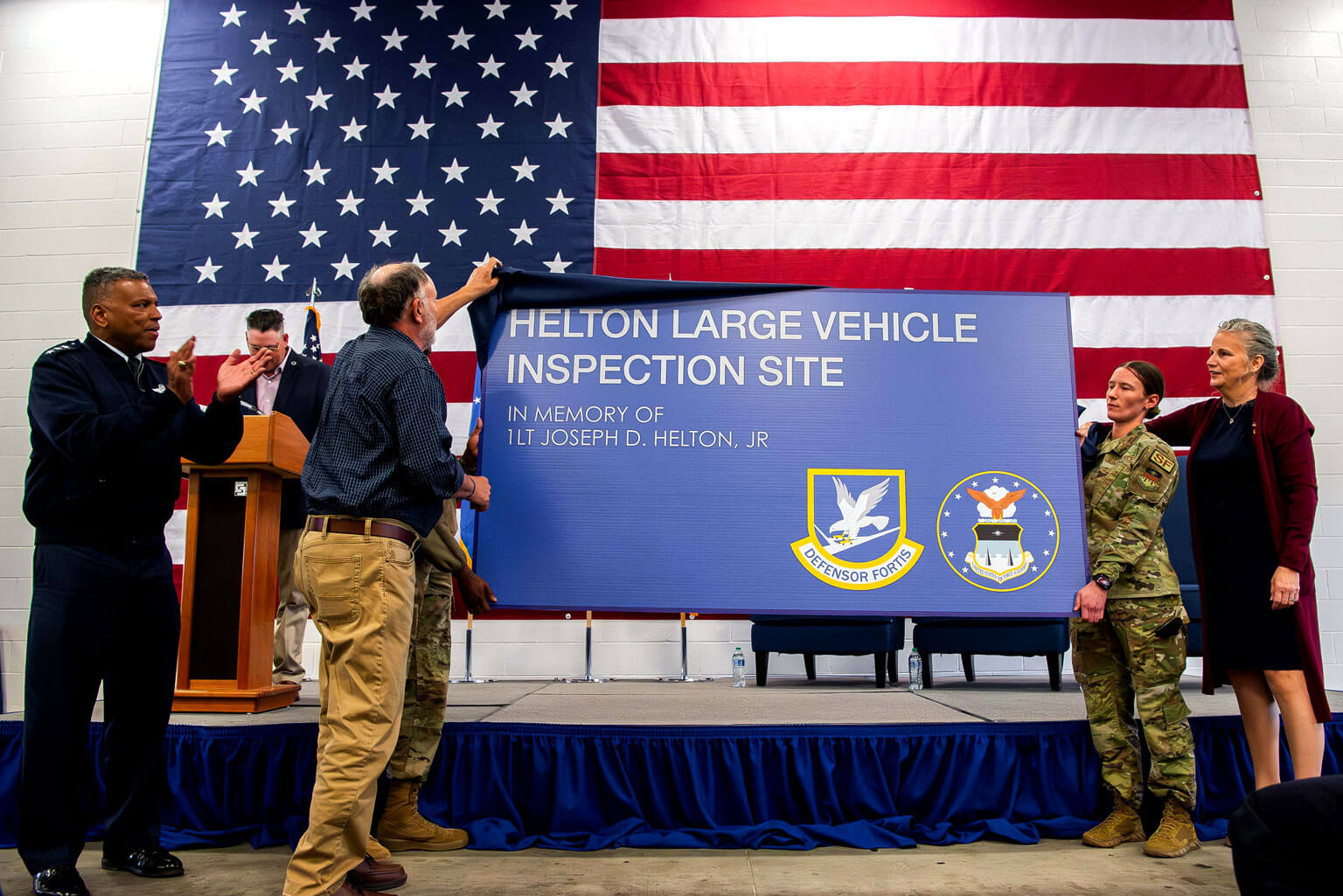 U.S. Air Force Academy Superintendent Lt. Gen. Richard Clark applauds as 1st Lt. Joseph D. Helton Jr.’s mother, Jiffy Helton-Sarver, watches his father, Joseph Helton, and Senior Airman Chelsea McComb unveil the new sign for the Large Vehicle Inspection Site. The Academy dedicated the 1st Lt. Joseph D. Helton Large Vehicle Inspection Site in a ceremony May 10, 2024. (U.S. Air Force photo by Trevor Cokley)