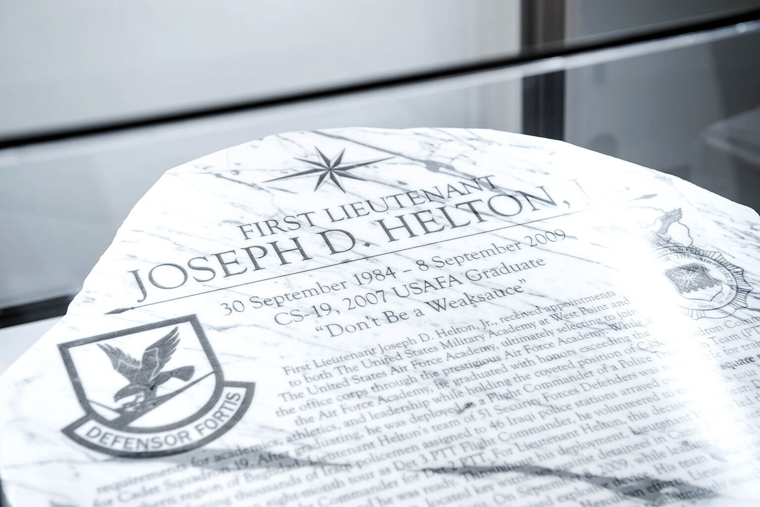 "A stone made from Terrazzo marble with the details of 1st Lt. Joseph D. Helton Jr.’s service is shown. It is part of a showcase that includes Helton’s U.S. Air Force Academy flight suit and parade uniform. The Academy dedicated the 1st Lt. Joseph D. Helton Large Vehicle Inspection Site in a ceremony May 10, 2024. (U.S. Air Force photo by Trevor Cokley)