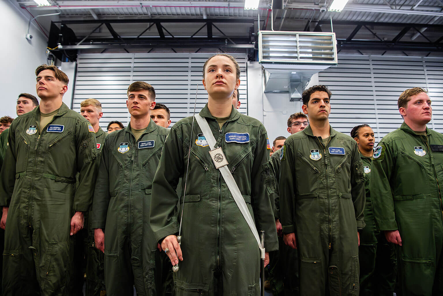 "Cadet 1st Class Morgan Matyoka leads U.S. Air Force Academy Squadron 19 in formation during the dedication of the 1st Lt. Joseph D. Helton Jr. Large Vehicle Inspection Site in a ceremony May 10, 2024. Helton, Class of 2007, was a member of the squadron. (U.S. Air Force photo by Trevor Cokley)