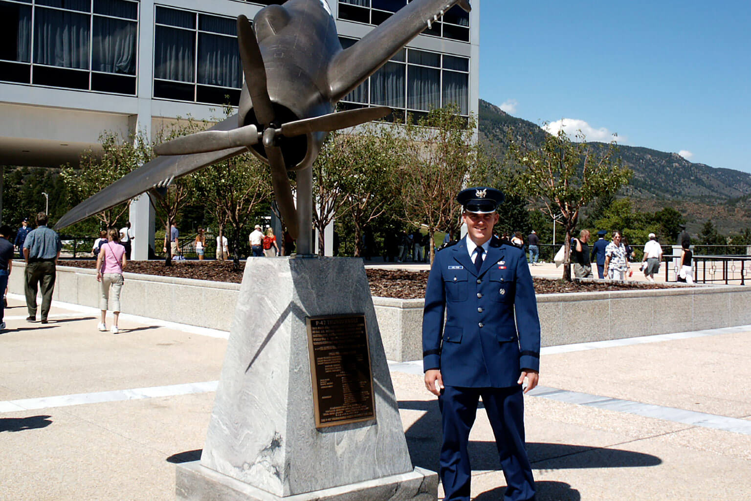 "Then-Cadet 4th Class Joseph D. Helton Jr. poses for a photo at the U.S. Air Force Academy Honor Court during Parents Weekend in September 2003. Helton was killed Sept. 8, 2009, of wounds sustained when his vehicle was hit by an improvised explosive device near Baghdad during a deployment in support of Operation Iraqi Freedom. (Courtesy photo provided by Jiffy Helton-Sarver)