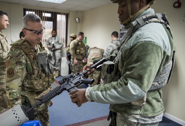 Airman 1st Class Cameron Rogers, 422nd Security Forces Squadron installation entry controller, clears an M4 carbine during a recall exercise at RAF Croughton, United Kingdom, Nov. 21, 2019. Quarterly recall exercises are a form of readiness for defenders to always be prepared to respond at a moment’s notice. (U.S. Air Force photo by Airman 1st Class Jennifer Zima)