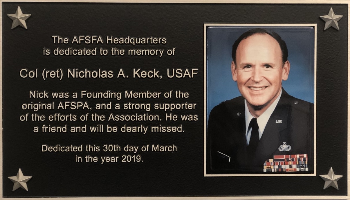 On the morning of 30 March 2019, during at the mid-year board meeting, President Scott Castillo and Executive Director John Probst unveiled a plaque which dedicated the AFSFA Headquarters in the memory of Col Nicholas A. Keck. Nick was a Founding and Life Member of AFSFA. He edited Tiger Flight for 15 years, served on the Board of Directors for two terms, was the AFSFA Secretary and the first inductee into the AFSFA Hall of Fame in 2008 and the only active duty member present at the founding of our Association. Nick’s contagious smile and laugh and candor will be sorely missed. Nick is survived by his wife Felice Hendrickson Keck, and their two children, Kristopher and Nicole.