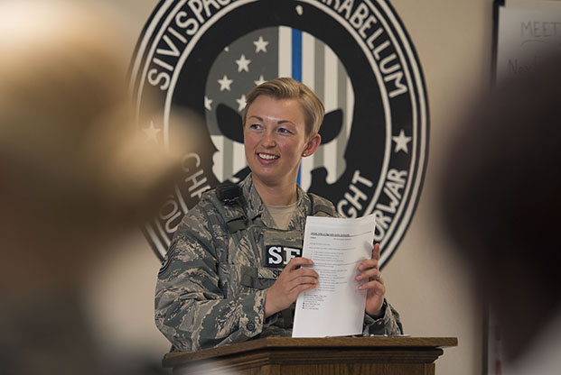 b. Most Outstanding Defender Award. This award is presented on behalf of the Director of Security Forces for outstanding leadership and performance throughout the competition. The three were nominated by their team, observed by the cadre as demonstrating exceptional leadership throughout the competition and evaluated by a panel of Chiefs.