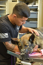 Fortunately, Veterinarian Dr. Heather Cameron was in the audience along with visiting U.S. Army Lt. Col. Sidney M. Cobb Jr. Once Arroyo saw that his MWD’s tooth was bleeding, they immediately took Aruba to the vet clinic so Cameron could examine him. She provided pain management to make him comfortable for the night, and took X-ray images the next day.