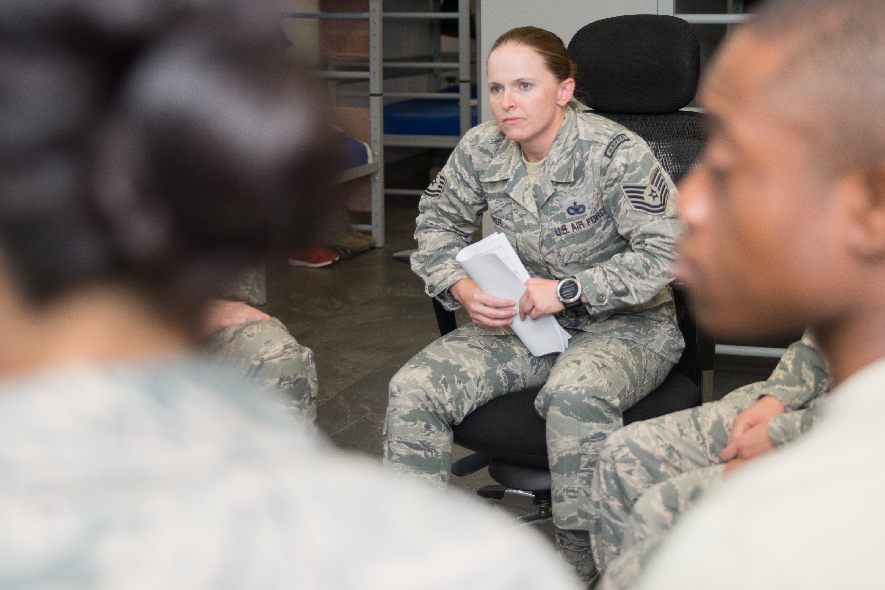 Tech. Sgt. Megan Harper leads a small group discussion with airmen in basic military training. Photo Credit: Andrew C. Patterson/Air Force