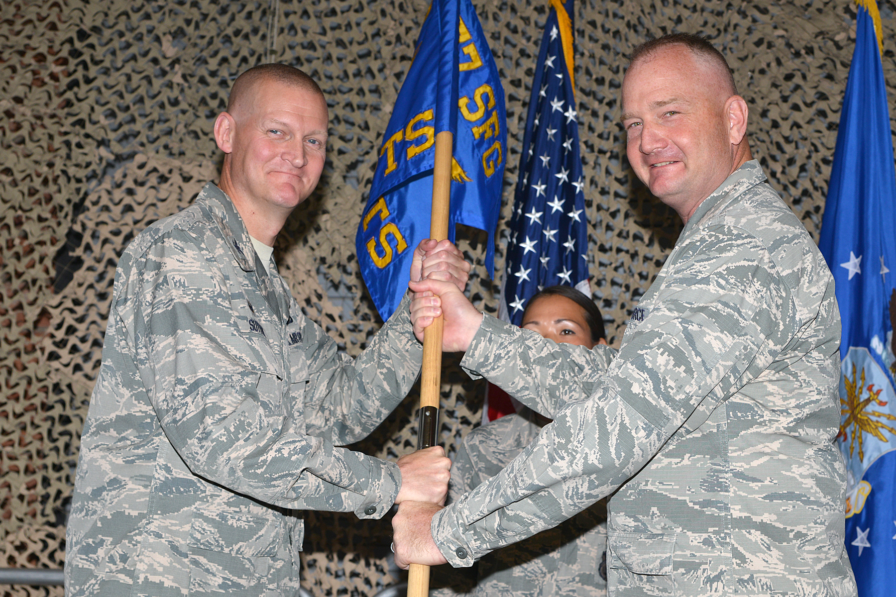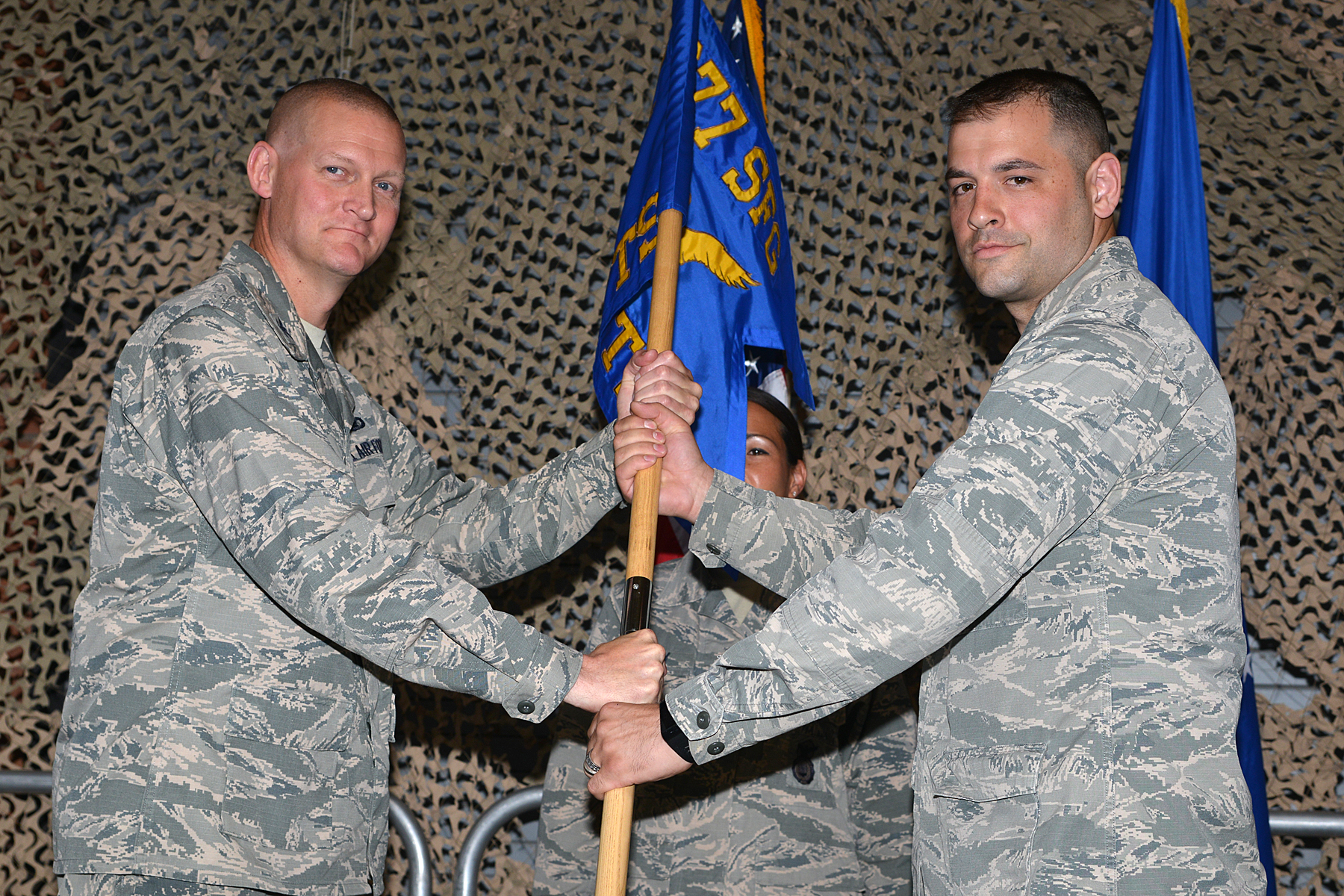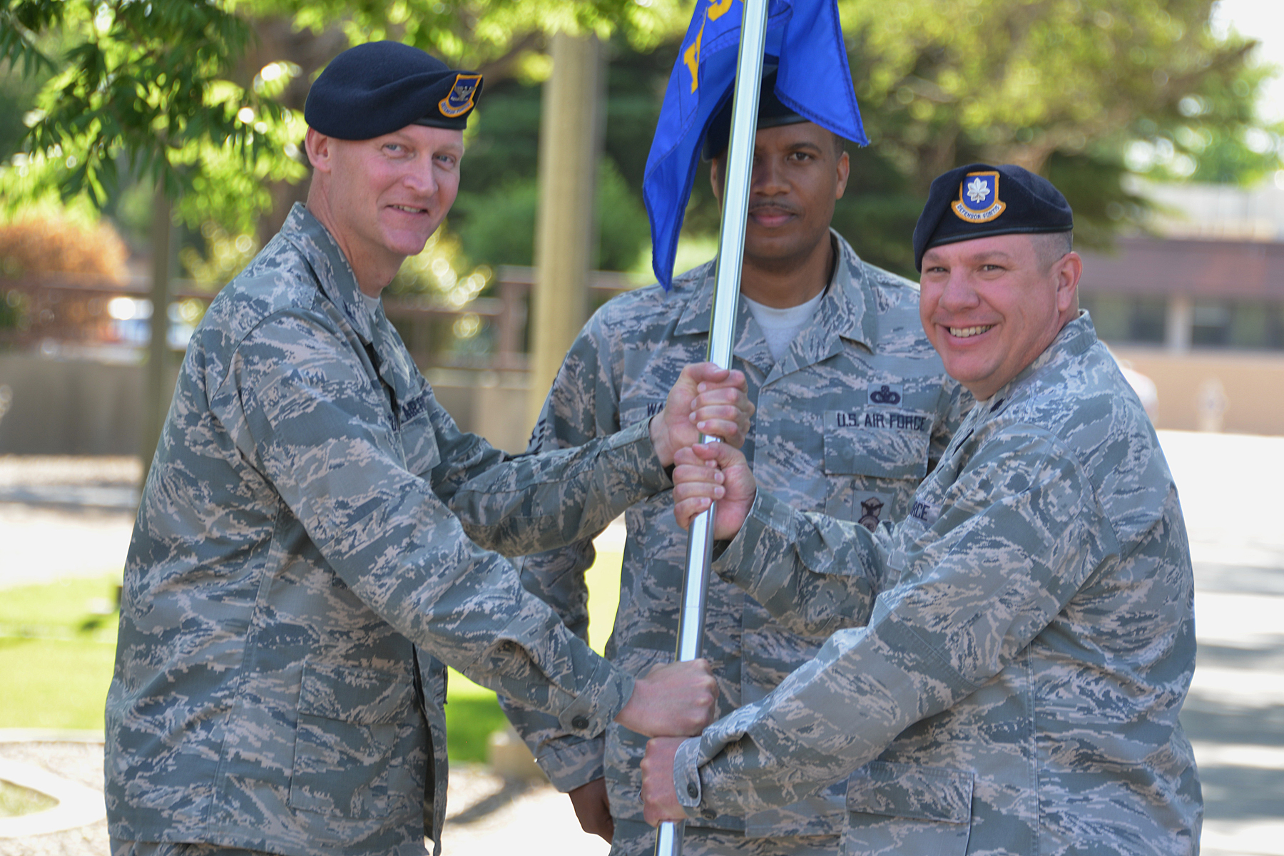 377 SFG Commander, Colonel Dustin Sutton, accepts the unit guidon from outgoing 377 Security Support Squadron Commander, Major Eric Judd, at Change of Command ceremony on 20 June 2017 at Kirtland AFB, NM. The following day at another Change of Command Major Judd became commander of the 377 SFS replacing outgoing commander Major Brenton Pickrell. Guidon bearer is SMSGT Regina Bailey.