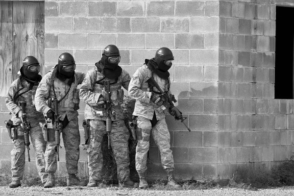 A team of 96th Security Forces Squadron Airmen prepare to enter a building during a shoot, move and communicate drill in June at Eglin Air Force Base, Fla. (U.S. Air Force photo/Samuel King Jr.)