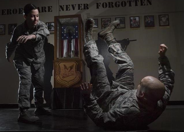 Staff Sgt. Kiirsten Gunterman, 374th Security Forces Squadron training instructor, performs a takedown on Senior Airman Ryan Vanicek, 374 SFS unit training manager at Yokota Air Base, Japan, Jan. 20, 2017. Gunterman spent 17 years practicing ballet before joining the Air Force. Her duties include instructing Combatives classes, where she teaches defenders to overcome larger, stronger oponents. (U.S. Air Force photo by Senior Airman Elizabeth Baker)