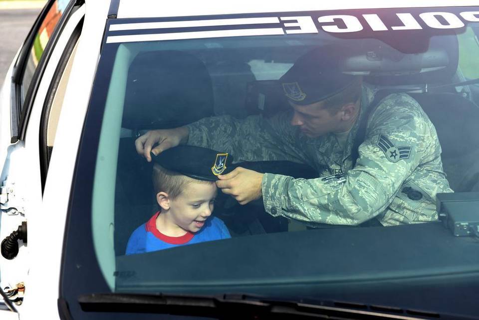 Senior Airman Sheldon Timmermeyer, 375th Security Forces Squadron, got the day started with his new friend Hayden who helped provide the police escort to their first destination of the day. Timmermeyer also helped to coordinate volunteers who played Batman and Joker for the event scenario for which Hayden helped the Airmen to track down. Photo by Senior Airman Megan Friedl