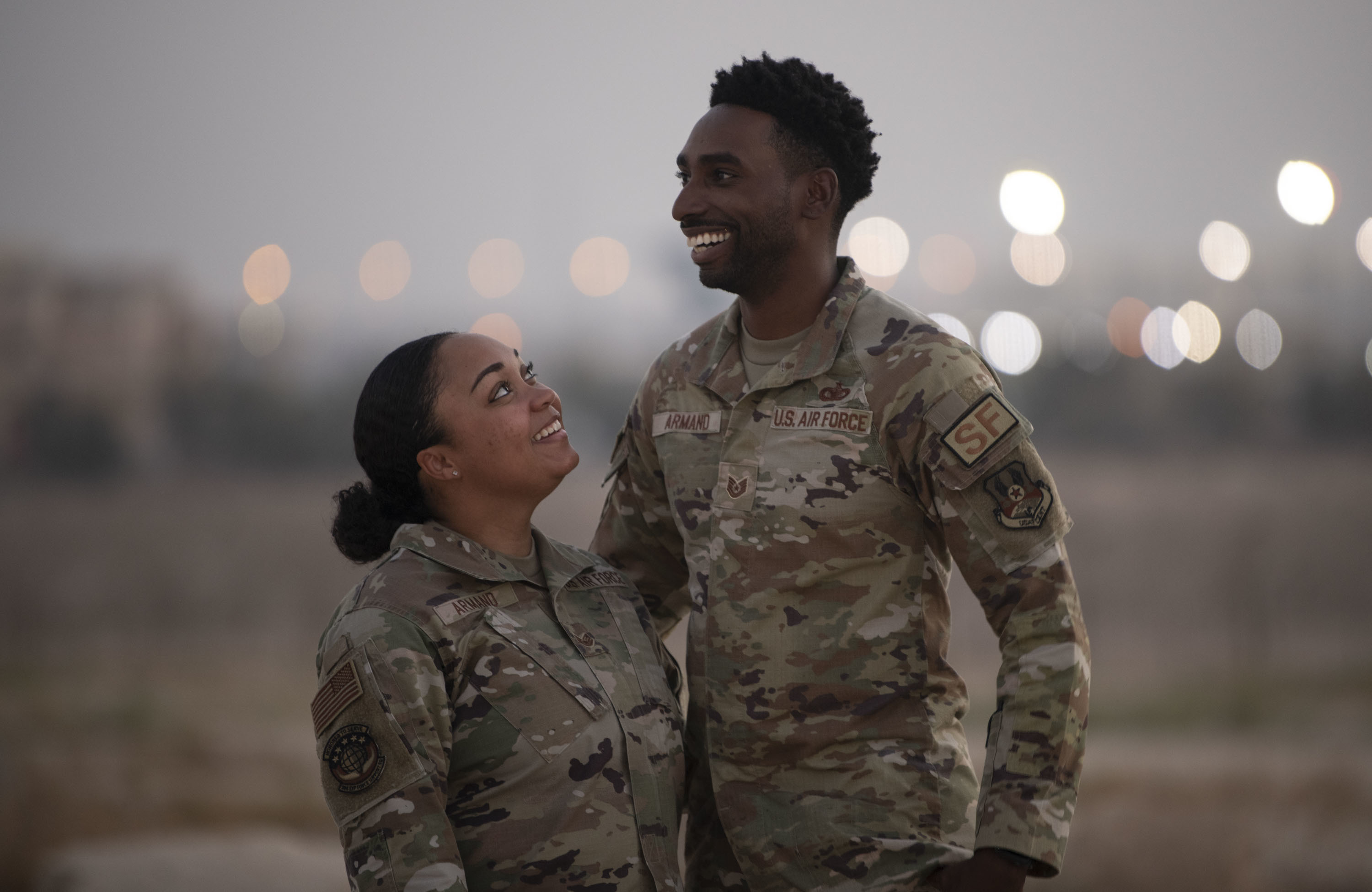 ALI AL SALEM AIR BASE, Kuwait – It’s fall of 2016 at Al Dhafra Air Base, United Arab Emirates, in the middle of the dining facility. A young Senior Airman Ashley Robinson goes up to an unknowing Staff Sgt. Vashard Armand to ask him about a friend on base. Vashard, not knowing who Ashley was talking about, answered her question and waved her off. Ashley, thinking nothing of the interaction, goes about her day, later that night running into none other than Vashard hanging out with friends. After a couple hours of talking, they realized they had many friends in common throughout the Air Force and had plenty in common themselves. After that night, one was rarely seen without the other.