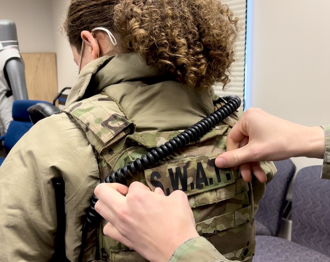 SrA Alexandranell Soto, a 354th Security Forces Special Response Team member, receives her duty identifier patch during a recognition ceremony 7 January 2022, on Eielson AFB, AK. An SRT is the military version of civilian law enforcement’s special weapons and tactics (SWAT). They are dedicated to the preservation of life and property during critical incidents and high-risk operations. (U.S. Air Force photo by A1C Elizabeth Schoubroek)