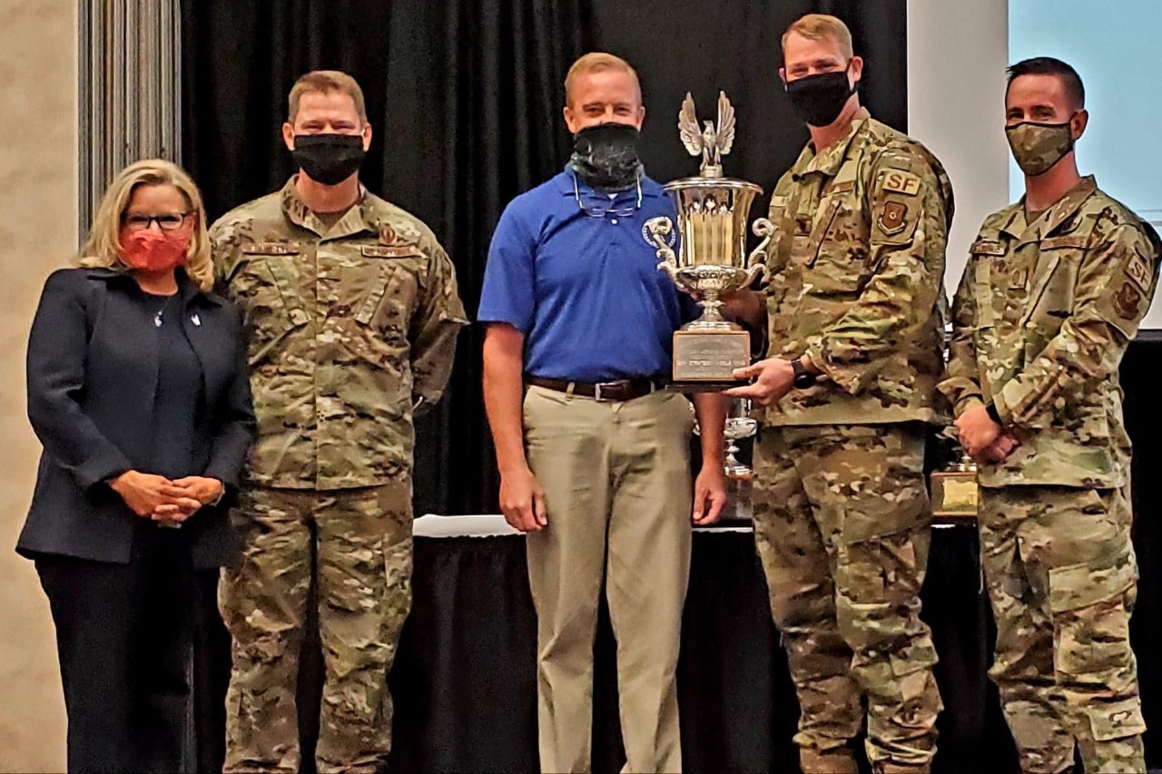 Major Jonathon Plyler (Operations Officer) accepting the trophy on behalf of Lt Col Jaroslaw Zrodlowski (Commander) and SMSgt Stollings (Squadron Superintendent) along with 90 MW/CC Colonel Bonetti and Wyoming Congresswoman Liz Cheney.